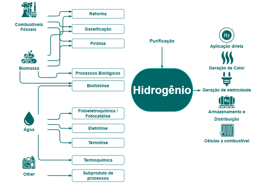 Figura 1. Cadeia do hidrogênio: matérias-primas, principais rotas de produção e aplicações gerais