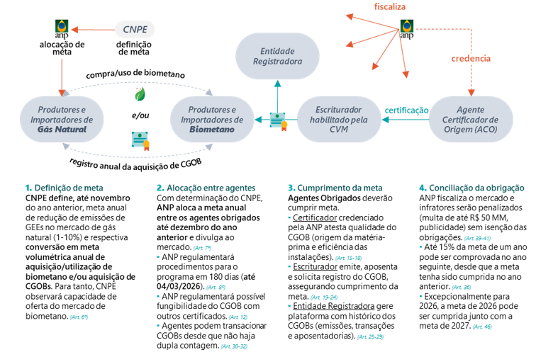 Como desdobramento da regulamentação da lei, a Consulta Pública MME nº 199/2025 – encerrada em 30 de novembro – propôs direcionamentos significativos para a política pública (e.g., definição da meta inicial de redução de emissões em 0,25%, visão preliminar dos parâmetros de intensidade de carbono para gás natural e biometano, ou metodologia de conversão para meta volumétrica), resultando em volume estimado de 85,86 MMm³ de biometano a serem mandatoriamente incorporados na oferta a partir de 2026.