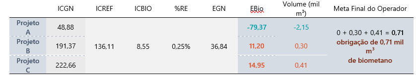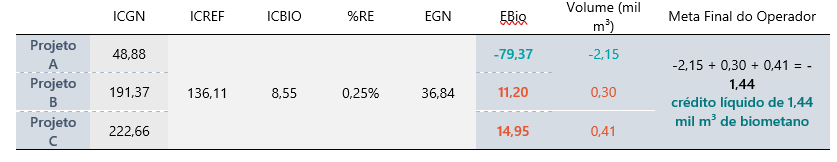 Ilustrativamente, tomemos como exemplo hipotético um Operador X, que possui três projetos: Projeto A, Projeto B e Projeto C. Todos os projetos possuem as respectivas ICGNs, calculadas pelo agente e aprovadas pelo governo: 48,88 gCO2eq/MJ, 191,37 gCO2eq/MJ e 222,66 gCO2eq/MJ. Utilizemos como ICREF a intensidade de carbono já calculada pela EPE[5] para “Gás Natural como insumo para geração elétrica” (ICREF = 136,11 gCO2eq/MJ) e para “Biometano” (ICBio = 8,55 gCO2eq/MJ), bem como a meta de redução de emissões e conteúdo energético médios já definidos pelo governo[3] (%RE = 0,25% e EGN = 36,84 GJ/mil m³). Com isso, tem-se: