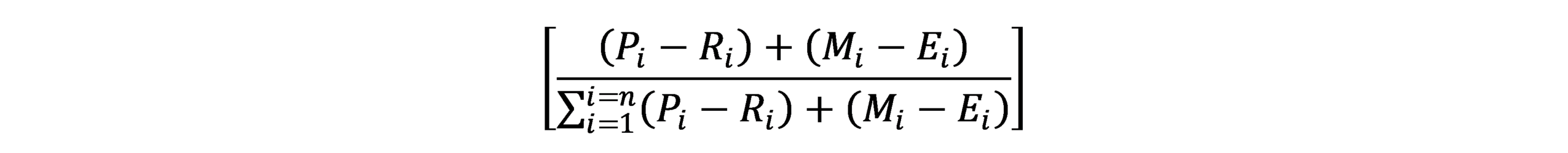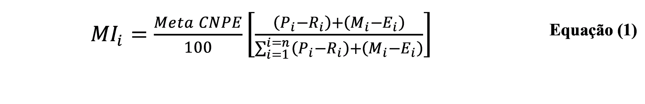 Onde MIi é a meta individual do agente obrigado i, Meta CNPE é a meta global de aquisição de biometano (em metros cúbicos), 100 é o fator de equivalência de 1 CGOB para 100 metros cúbicos de biometano, Pi é a produção bruta de gás natural do agente obrigado i, Ri é o volume de gás natural reinjetado pelo agente obrigado i , Mi é a quantidade importada de gás natural pelo agente obrigado i, Ei é a quantidade exportada de gás natural pelo agente obrigado i, e n é o número de agentes obrigados.