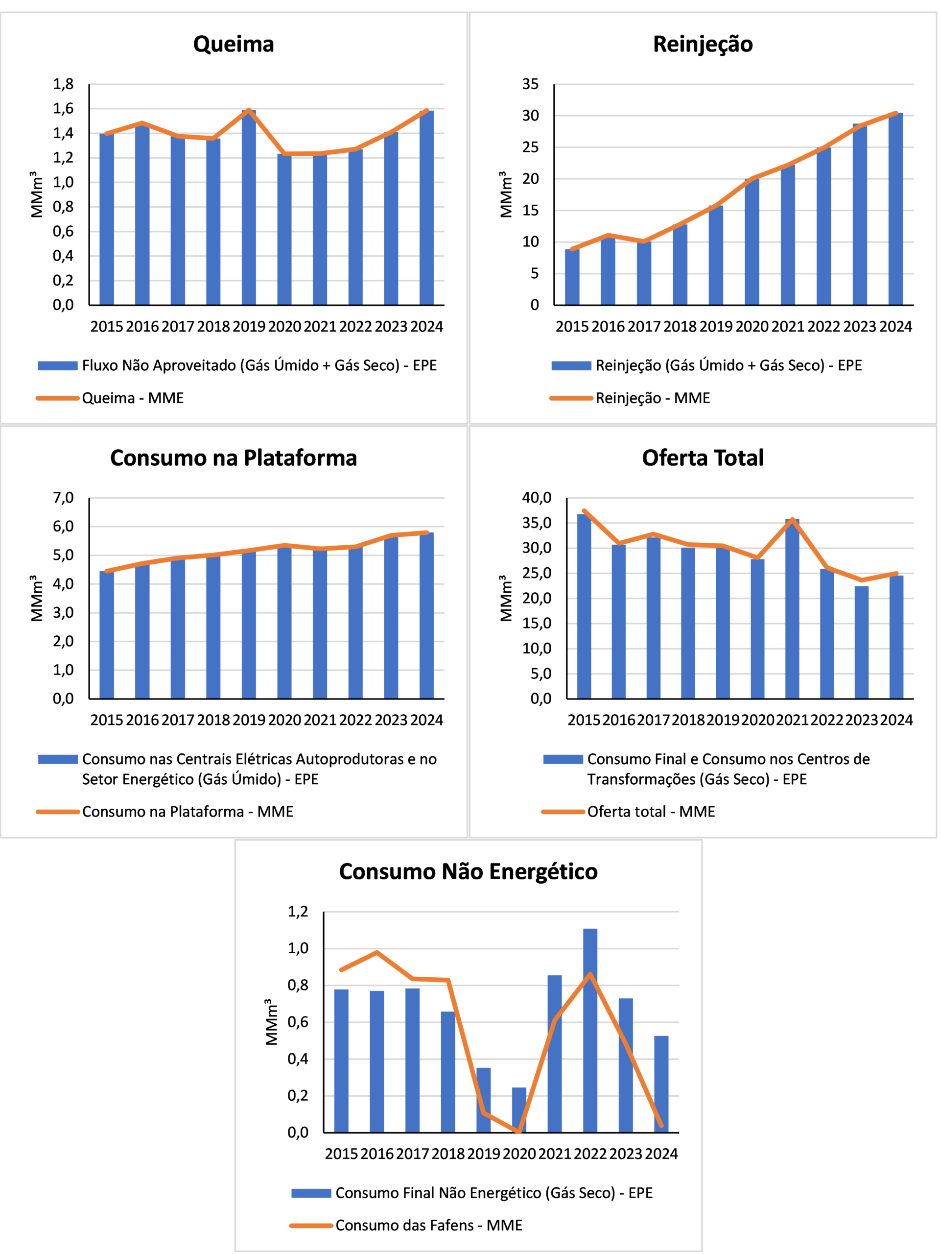A Figura 1 compara os dados da Matriz Energética do BEN, disponibilizados pela EPE (2025a), com os dados do Boletim Mensal de Acompanhamento da Indústria de Gás Natural, disponibilizados pelo MME (2025). Observa-se que a soma dos fluxos “Não Aproveitada” de gás úmido e gás seco nos dados da EPE (2025a) corresponde aos volumes queimados nos dados do MME (2025). De forma semelhante, a soma dos fluxos “Reinjeção” de gás úmido e gás seco nos dados da EPE equivale aos volumes reinjetados nos dados do MME (2025). Como esses fluxos não são considerados pela EPE (2025b) na definição da quantidade de referência de gás natural no mercado brasileiro, os volumes queimados e reinjetados não são contabilizados na base de cálculo. Essa exclusão está em conformidade com o § 1º do art. 7º do Decreto nº 12.614/2025, uma vez que tais fluxos não foram comercializados e os volumes reinjetados também não geraram emissão de GEE.