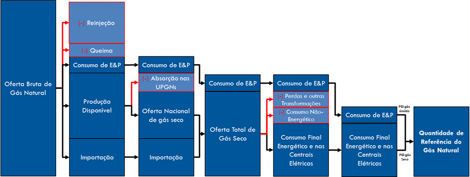 A EPE (2025b) afirma que, em atendimento ao § 1º do art. 7º do Decreto nº 12.614/2025, foram excluídos da base de cálculo os fluxos nos quais o gás natural não seja comercializado ou cuja utilização não gere emissão de Gases do Efeito Estufa (GEE). Com base nesse argumento, a EPE (2025b) excluiu os volumes não aproveitados, reinjetados, consumidos ou perdidos nos centros de transformações, com exceção das centrais elétricas, e consumidos no setor não-energético.