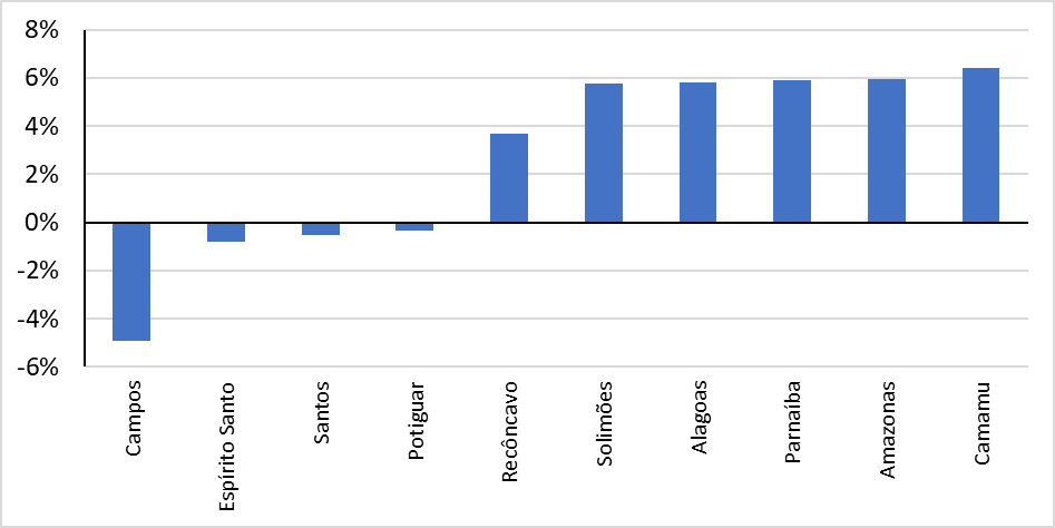 Observa-se que os produtores da bacia de Campos apresentariam a maior redução na participação relativa, seguidos pelas bacias do Espírito Santo, Santos e Potiguar. Em outras palavras, caso a queima de gás natural fosse desconsiderada da base de cálculo definida na Resolução ANP nº 995/2026, os produtores dessas bacias tenderiam a ter suas metas de aquisição de CGOB reduzidas. Em contraste, as demais bacias apresentariam ganhos em sua participação relativa e, consequentemente, seus produtores tenderiam a enfrentar metas individuais mais elevadas.