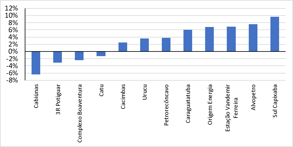 A Figura 4 apresenta essas estimativas. Nota-se que os produtores que utilizam a UPGN de Cabiúnas (isto é, produtores das bacias de Santos e de Campos) apresentariam a maior redução na participação relativa caso os volumes absorvidos nas UPGNs fossem excluídos da quantidade de referência de gás natural. Além disso, os produtores que utilizam as UPGNs 3R Potiguar (antiga UPGN Guamaré, localizada na bacia do Potiguar), Complexo Boaventura (associada à Rota 3, na Bacia de Santos) e Catu também apresentariam redução em suas participações relativas. Consequentemente, tenderiam a ter diminuição em suas metas individuais de aquisição de CGOB. Por outro lado, os produtores que utilizam as demais UPGNs apresentariam aumento em suas participações com a exclusão dos volumes absorvidos no processamento do gás natural, o que tenderia a elevar suas metas individuais.