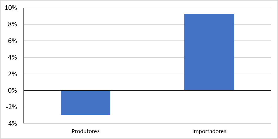 Cabe mencionar ainda que a análise anterior comparou apenas a alteração na participação relativa da oferta doméstica de gás natural. A exclusão dos volumes queimados e absorvidos nas UPGNs da base de cálculo da Resolução ANP nº 995/2026 também afetaria de maneira distinta a participação relativa de produtores domésticos e de importadores. A Figura 5 mostra essa estimativa, utilizando os dados do Boletim Mensal de Acompanhamento da Indústria de Gás Natural, disponibilizados pelo MME (2025). Nota-se que, enquanto os produtores teriam suas participações relativas reduzidas, os importadores teriam suas participações aumentadas. Isso ocorre porque a exclusão desses volumes não afetaria os importadores, mas reduziria o volume total comercializado.
