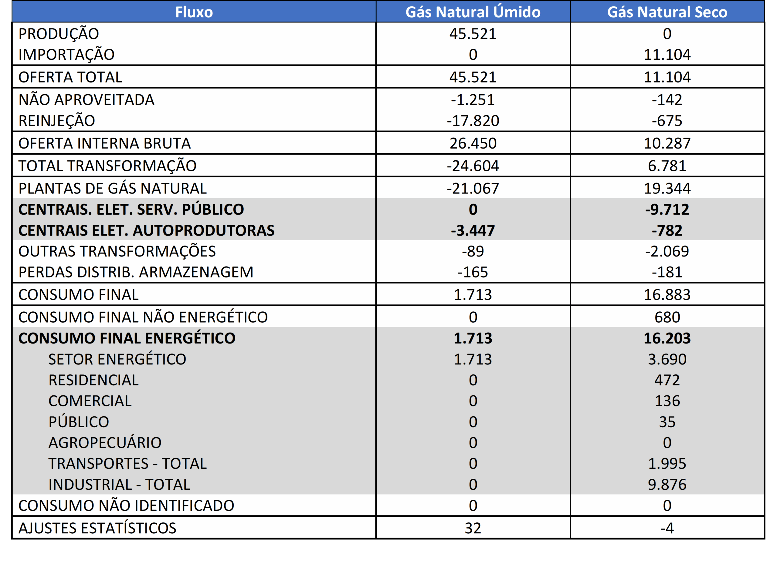 Tabela 1 – Fluxos de gás natural úmido e seco na Matriz Energética do Balanço Energético Nacional (média 2015-2024 em MMm³)