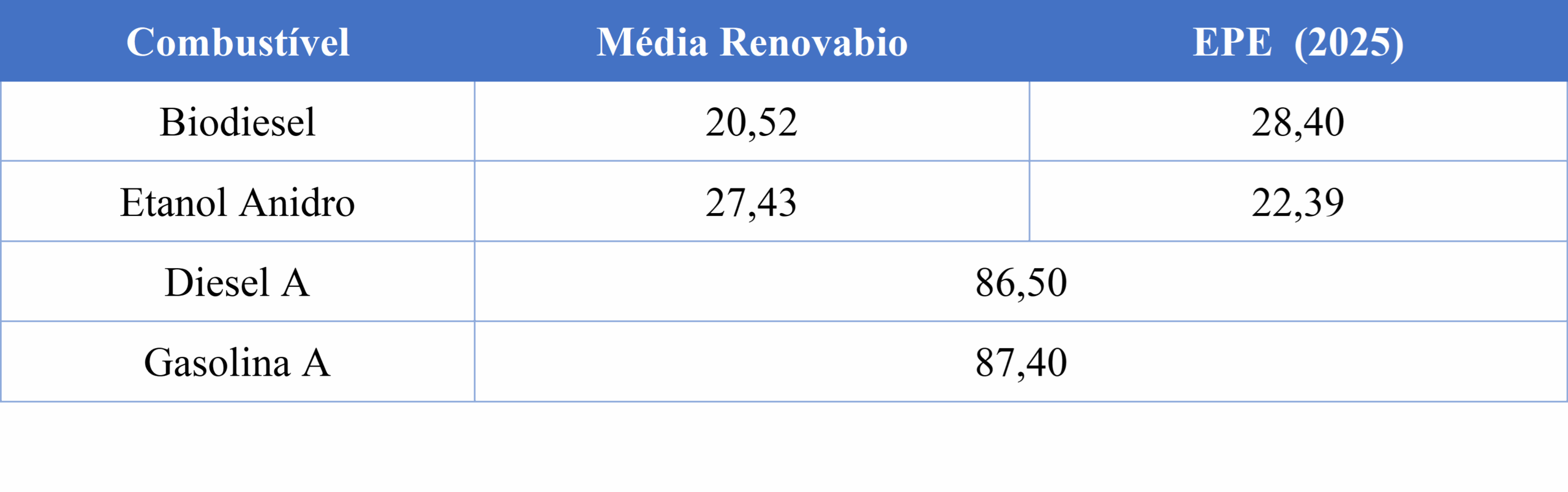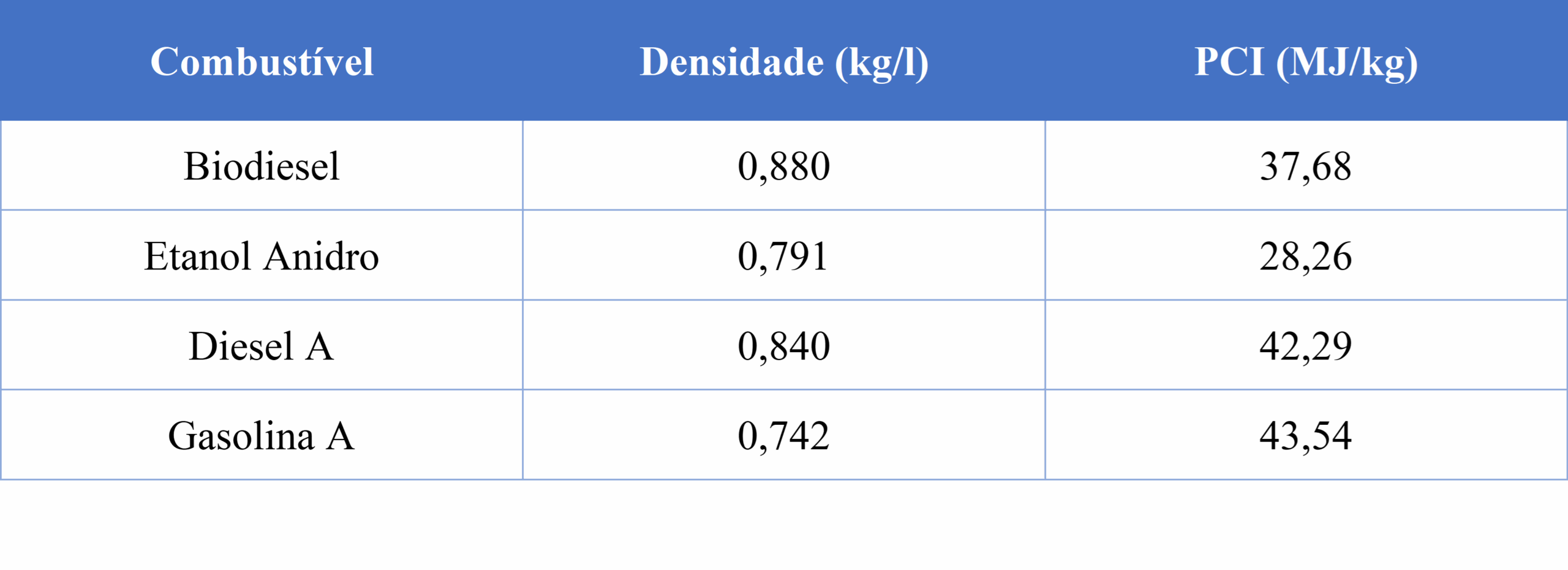 A Tabela 1 apresenta as premissas sobre o PCI e densidade dos combustíveis analisados. As informações referentes à gasolina A, diesel A, etanol anidro e biodiesel foram obtidas da Resolução ANP nº 758/2018. Ressalta-se que esses valores são iguais aos valores utilizados no estudo anterior.