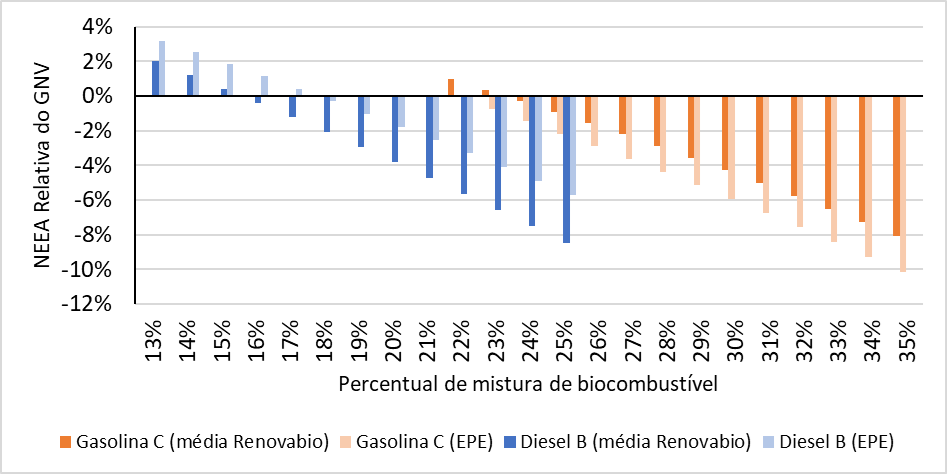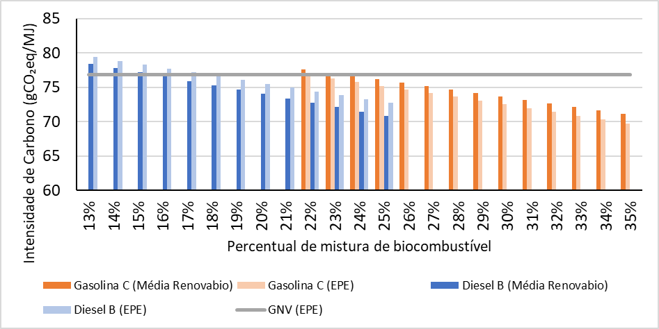 No cenário “Média Renovabio”, esses resultados se mantêm para qualquer mistura de etanol anidro acima de 23,6%. Nesses casos, a substituição da gasolina C por GNV resultaria em aumento das emissões de GEE, podendo atingir até 8,1% na adição máxima de 35% de etanol. Por outro lado, a imposição do percentual mínimo de 22% possibilitaria uma redução da emissão de apenas 1% para cada MJ de GNV utilizado em substituição à gasolina C.
