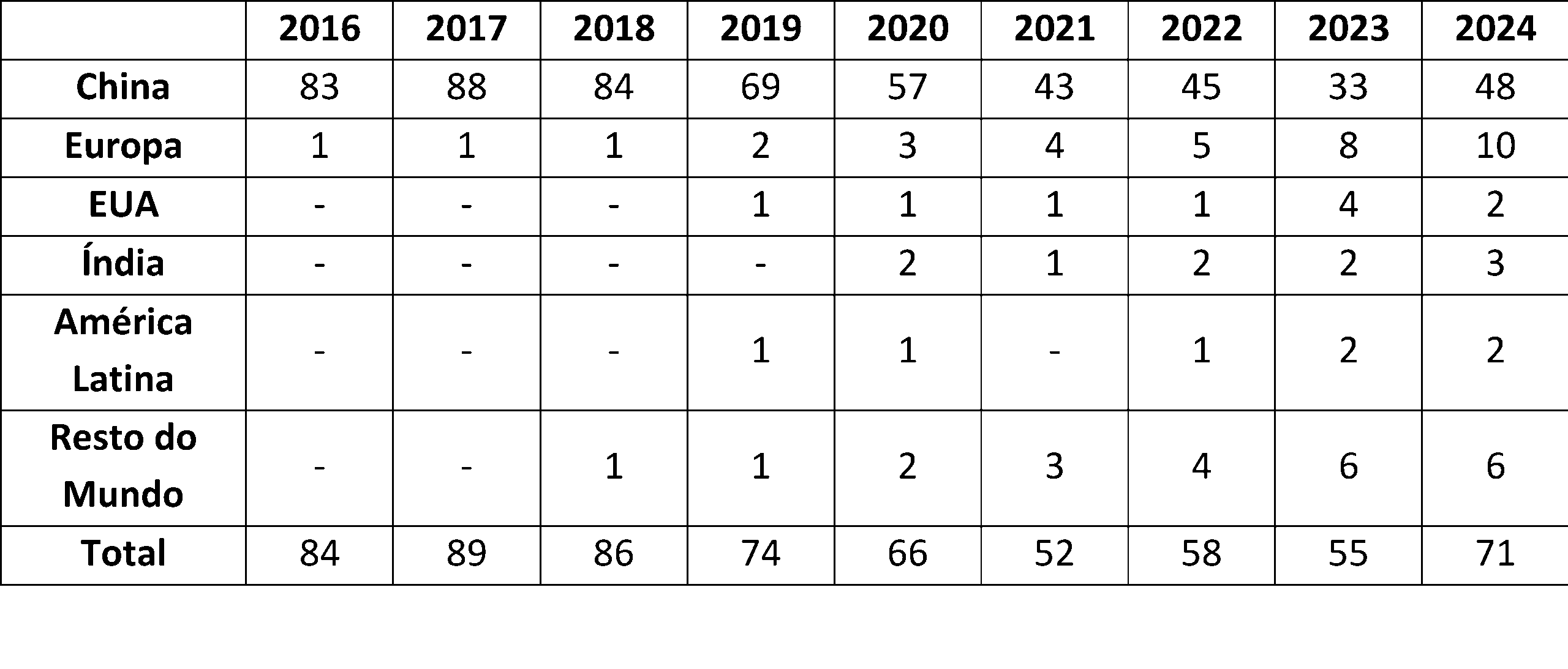 Através da tabela 1, podemos notar que entre 2016 e 2024 houve uma redução da participação da China por conta de uma desaceleração do seu mercado e um aumento das vendas em outras regiões, com destaque para a Europa. Se em 2016 e 2017 a China apresentou uma participação de cerca de 99% nas vendas de ônibus elétricos no mundo, tal valor foi de cerca de 68% em 2024.