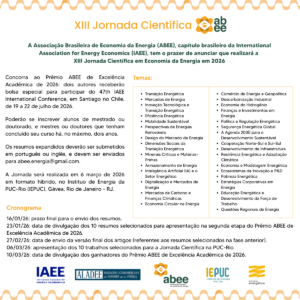 Prazo prorrogado para envio de resumos – XIII Jornada Científica da ABEE 2026 Niágara Rodrigues, Luciano Losekann, Edmar de Almeida e Diogo Lisbona Romeiro 19/01/2026 Leia Mais »
